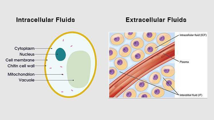 इस प्रकार, ICF एवं ECF में उनकी परस्पर आवश्यकताओं के अनुसार विभिन्न प्रकार के ions की मात्रा में कुछ कुछ भिन्नता होती है। ICF में K+, Mg++ एवं PO4– – – की मात्रा ECF से अधिक होती है एवं ECF में Na+, Ca++ एवं CI– की मात्रा ICF से अधिक होती है। यदि electrical activity के अनुसार देखें तो इन सब में Na+ एवं K+ सर्वाधिक महत्वपूर्ण हैं। ECF में Na+, ICF में Na+ की अपेक्षा 14 गुना अधिक मात्रा में मिलता है। (142 vs 10 mg/l)। इसके विपरीत ICF में K+, ECF में K+ की अपेक्षा 35 गुना अधिक मात्रा में होता है (140 vs 4 mg/l)। Na+ एवं K+ के स्तरों की यह भिन्नता ही cells की electrical activities को संचालित कराती है।