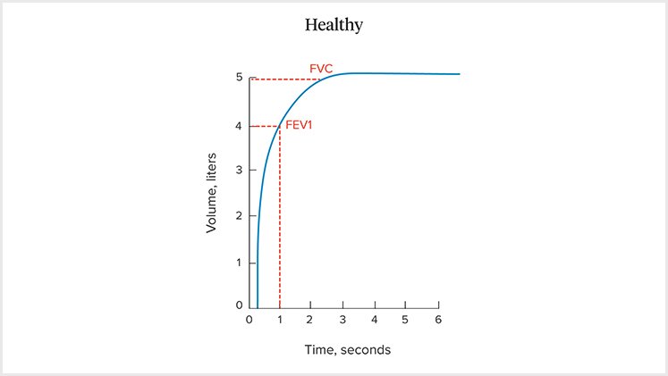 Forced expiratory volume in 1 second (FEV1) - इसके लिए भी रोगी को अपनी पूरी क्षमता से गहरी सांस लेकर फिर उसे पूरी क्षमता से, एवं पूरी तीव्रता से बाहर निकालने को कहते हैं। FVC के लिए जहाँ expiratory air के पूरे volume (FEV) को नापा जाता है वहीँ FEV1 के लिए expiratory air के केवल पहले सेकंड में निकले volume को ही नापा जाता है। सामान्यतः पहले सेकंड में ही कोई व्यक्ति, कुल expiratory volume का 83% (70-90%) भाग बाहर निकाल सकता है।
